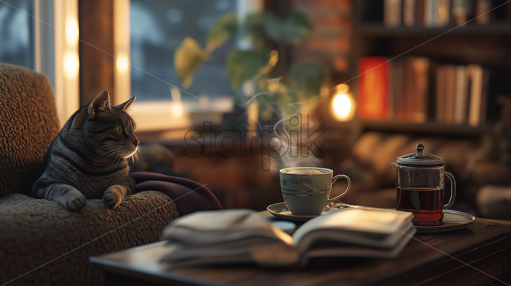 A warm, inviting corner with books, a cat