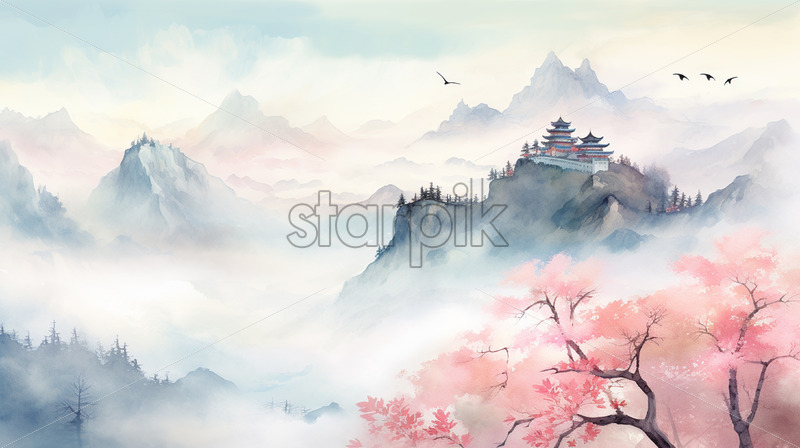 A watercolor illustration in Asian style, with mountains, pagodas, trees