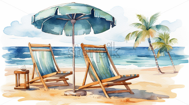 A watercolor illustration in clipart style with a beach
