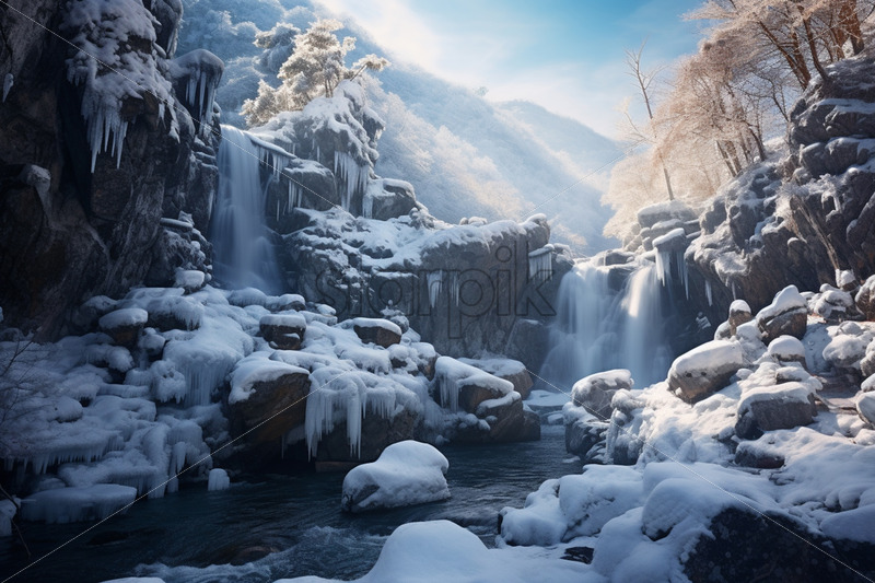 A waterfall in the mountains in winter