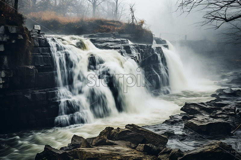 Wooden relaxing area on the sovata lake in romania, rest area surrounded by historic forested mountains, rainy day, fog and reflection, near salt mine