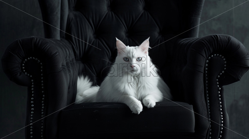 A white cat on a black armchair