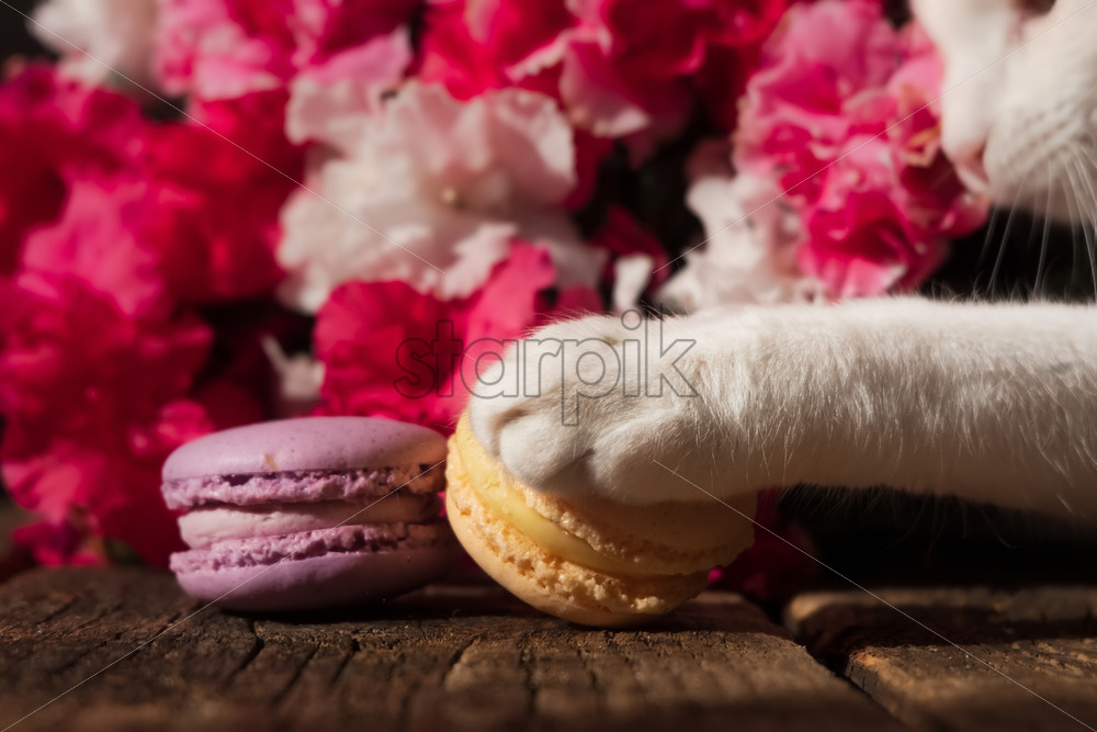 A white paw of the cat reaching for a yellow creamy macaroon on the wooden board, pink bouquet of flowers in the background