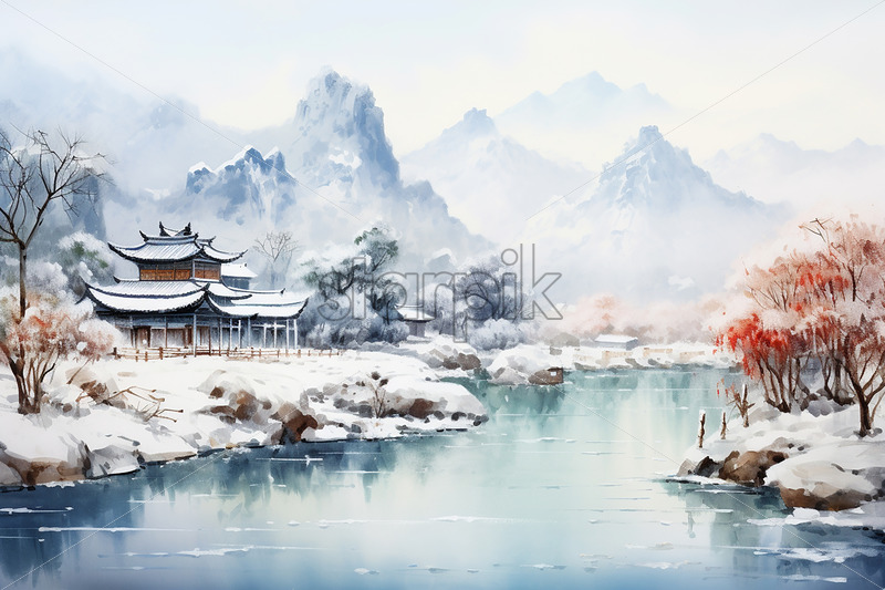 A winter landscape from ancient China, watercolor