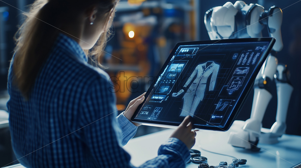 A woman designing her outfit on a futuristic tablet with 3D rendering
