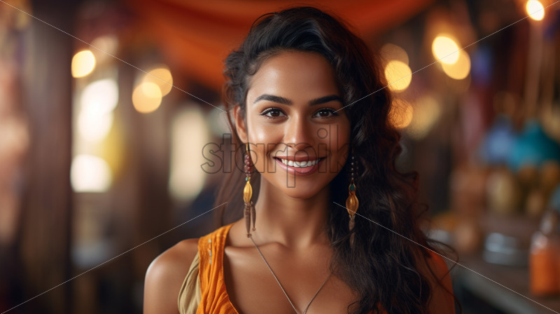 Young woman posing in a studio with red walls and furniture. Old vintage TV