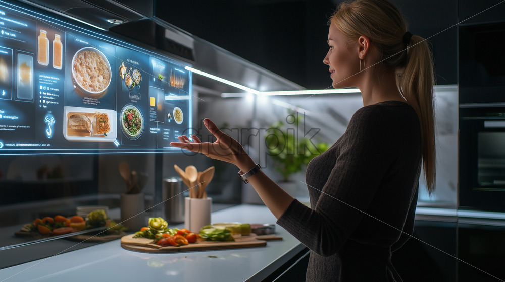 Home » Shop » AI Illustration » A woman in a smart kitchen using voice commands to control appliances