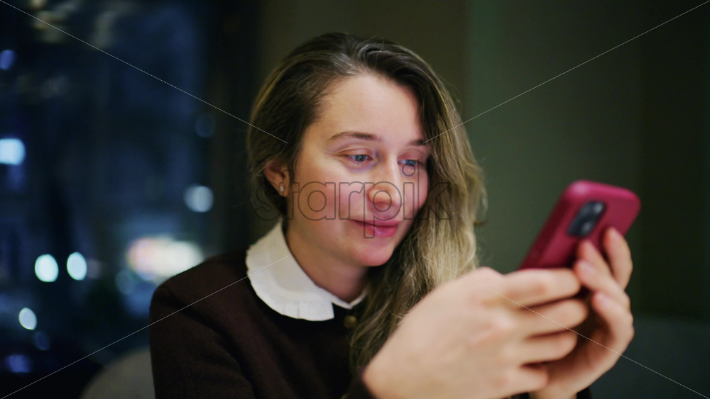 A woman indoors at night, softly lit, looking at her phone with a slight smile