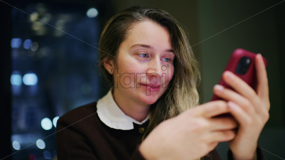 A woman indoors at night, softly lit, looking at her phone with a slight smile