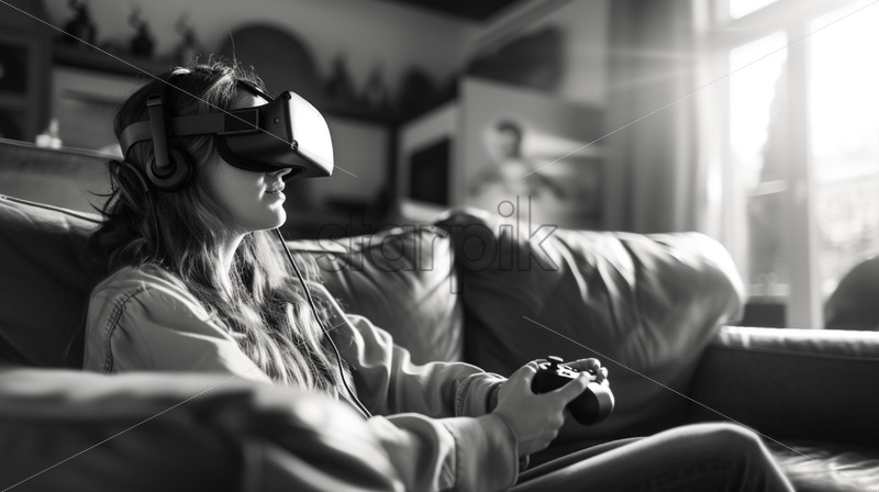 A woman playing a VR game, monochrome