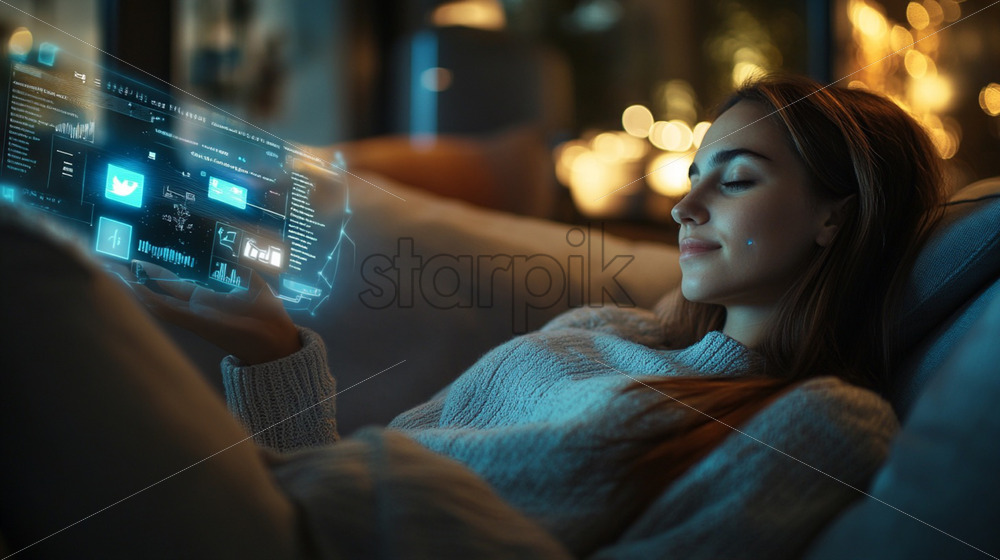 A woman relaxing on a sleek sofa, scrolling through a holographic social media interface