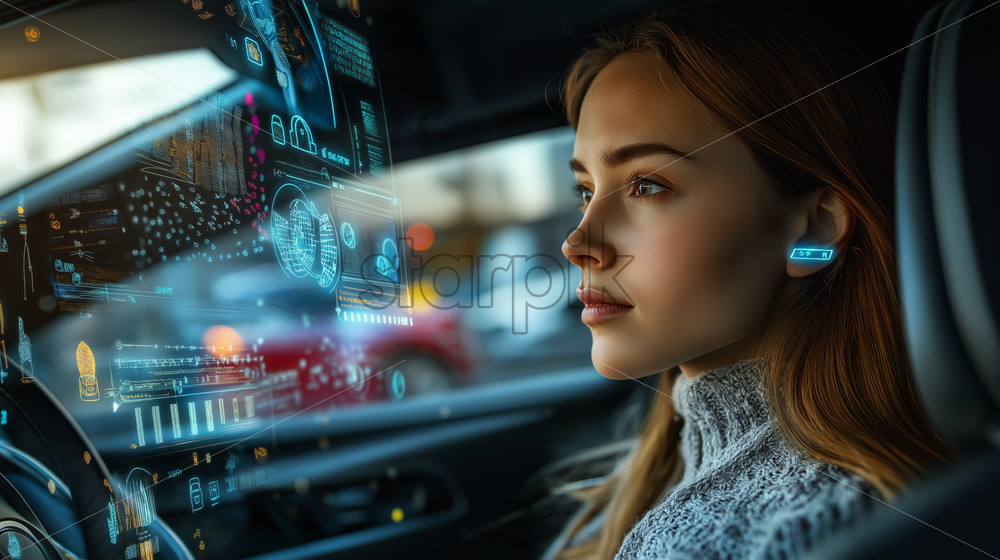 Home » Shop » AI Illustration » a woman riding a futuristic self driving car