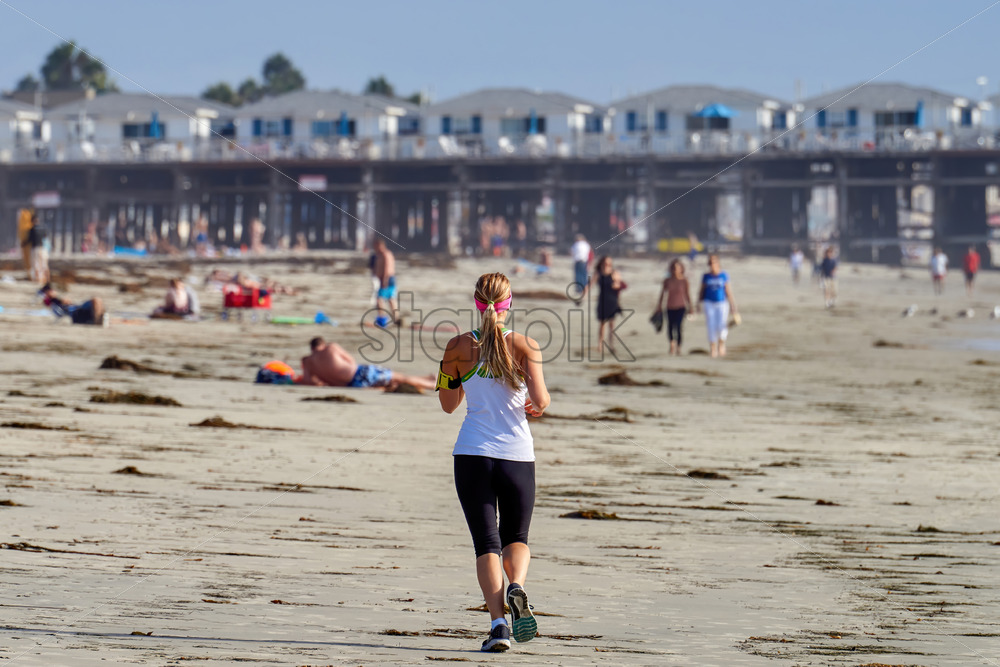 A woman running on the beach with pier and walking, resting people on the background in San Diego, USA