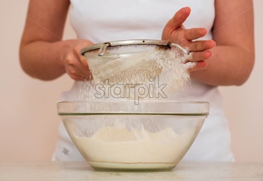a woman sifts wheat flour through a sieve, Chisinau, Moldova