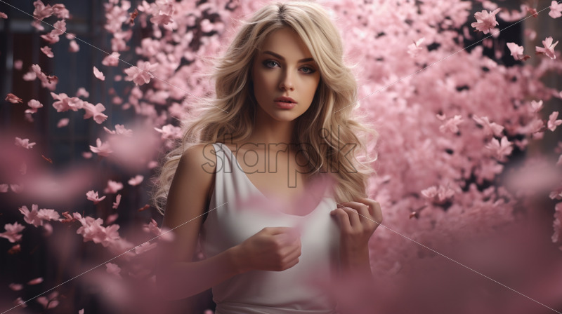 Japanese woman in a cherry orchard, traditional dress, spring blossom
