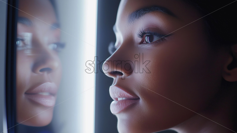 A woman using a virtual makeup app projected onto a smart mirror