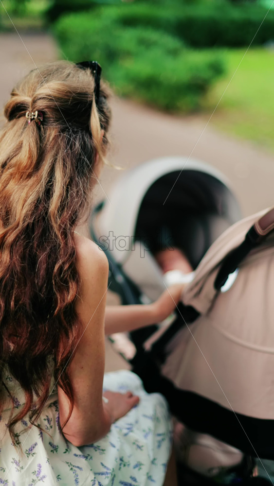 A woman with long curly hair holding a stroller while sitting on a park bench surrounded by greenery. Vertical Royalty Free Stock Video Footage