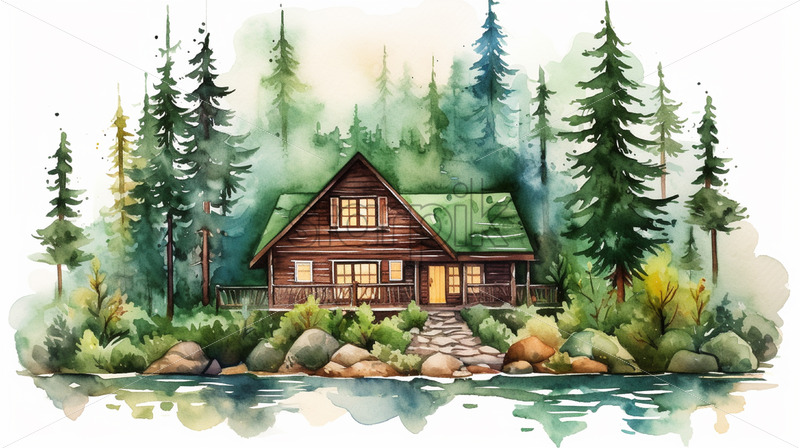 A wooden cabin in the forest, watercolor in clipart style