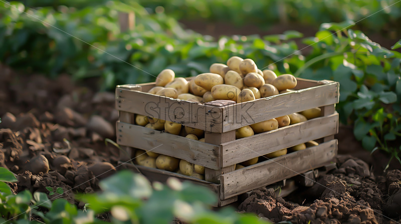 Home » Shop » Uncategorised » A wooden crate with potatoes in it in a field