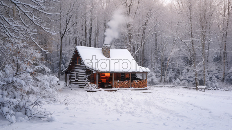 Home » Shop » Uncategorised » A wooden house in the forest in winter with smoke coming out of the chimney