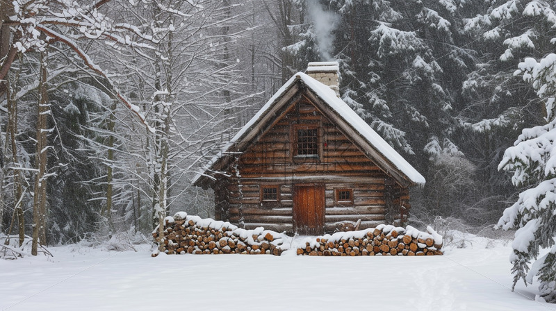A wooden house in the forest in winter with smoke coming out of the chimney