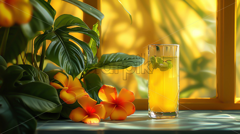 A yellow cocktail with ice on a yellow background with tropical leaves