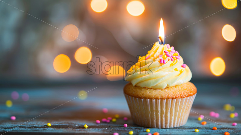 A yellow vanilla cupcake with a candle