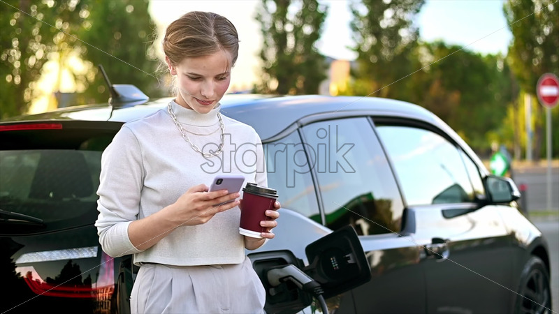 A young blonde woman with coffee using smartphone at a car charging station with electric car nearby in Chisinau at sunset, Moldova. Slow motion Royalty Free Stock Video Footage