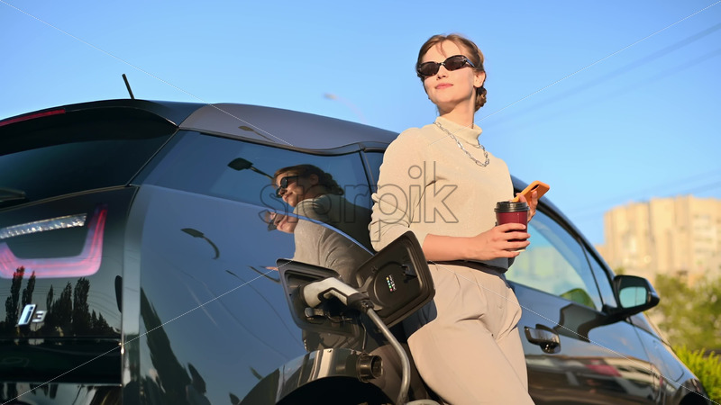 A young blonde woman with smartphone and coffee at a car charging station with charging electric car nearby in Chisinau, Moldova Royalty Free Stock Video Footage