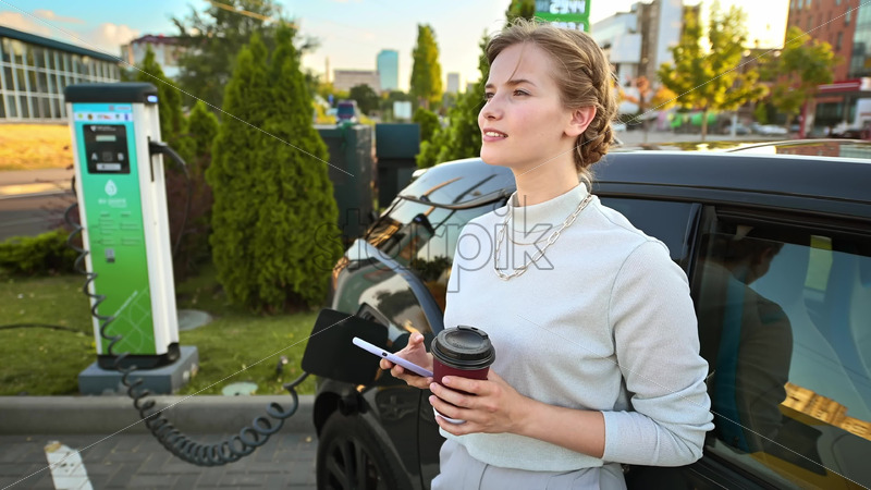 A young blonde woman with smartphone and coffee at a car charging station with charging electric car nearby in Chisinau, Moldova Royalty Free Stock Video Footage