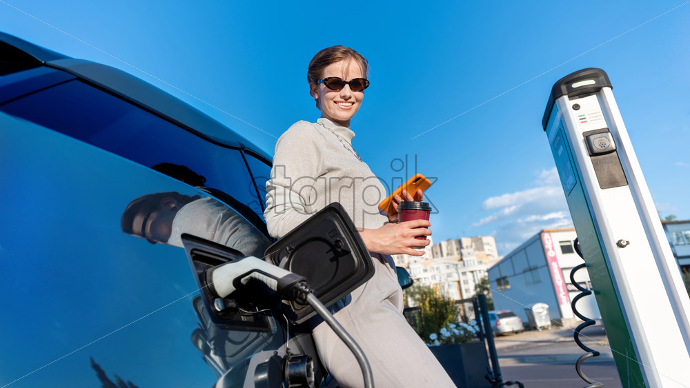 Home » Shop » photo » A young blonde woman with smartphone and coffee at a car charging station with charging electric car nearby in Chisinau, Moldova