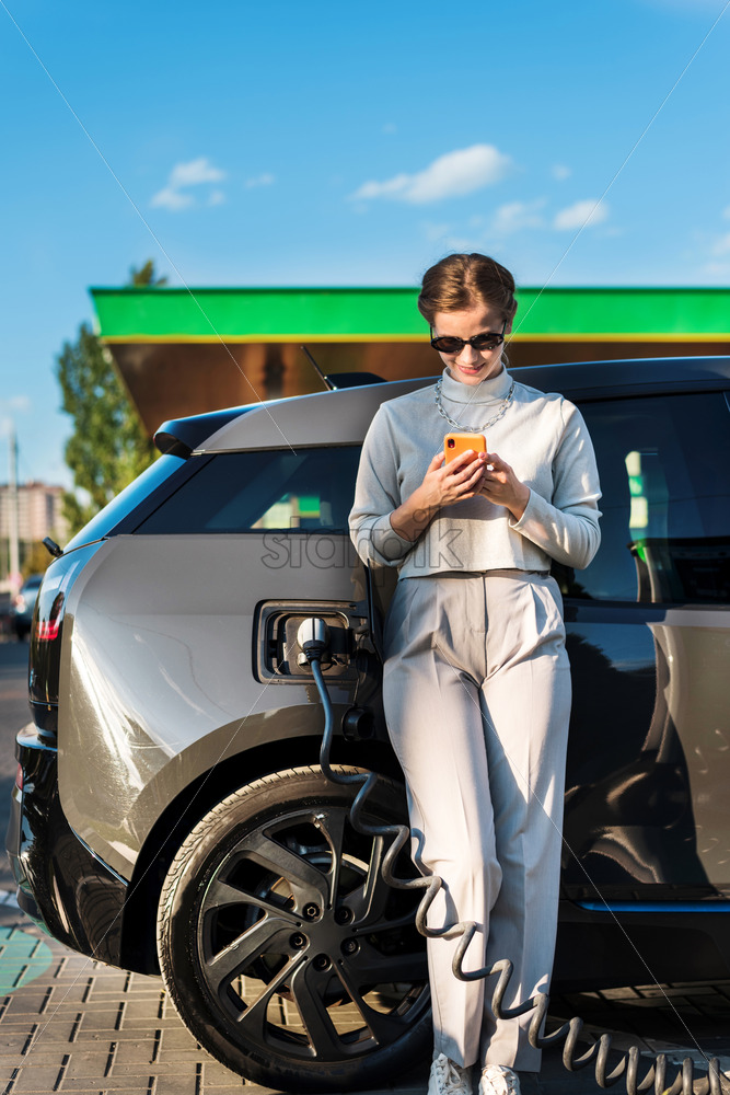 A young blonde woman with smartphone at a car charging station with charging electric car nearby in Chisinau, Moldova