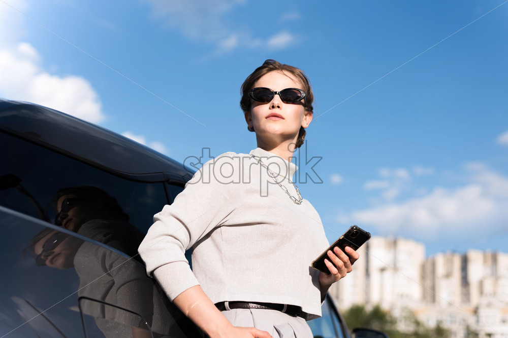 Home » Shop » photo » A young blonde woman with smartphone at a car charging station with electric car nearby in Chisinau, Moldova