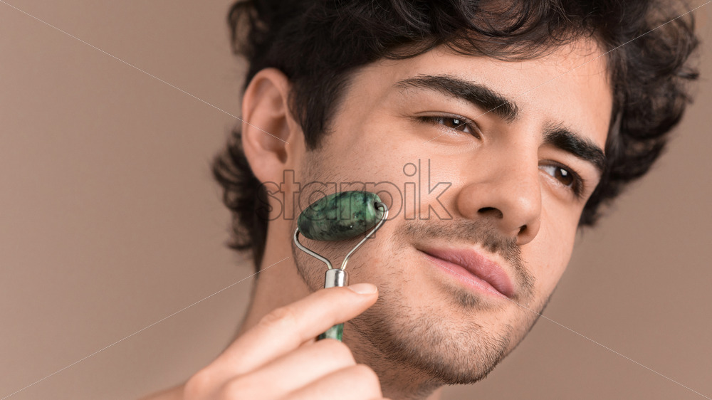 A young caucasian man with stubble beard is doing a facial massage using a roller