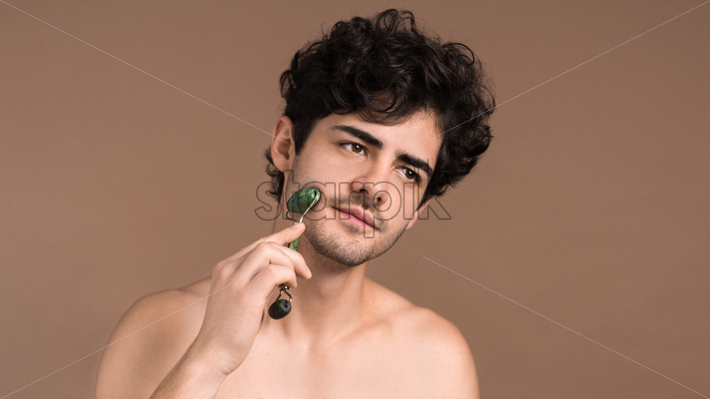 A young caucasian man with stubble beard is doing a facial massage using a roller