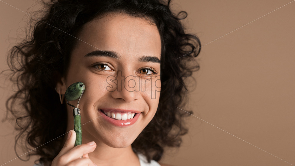 A young caucasian smiling woman is doing a facial massage using a roller, looking into the camera
