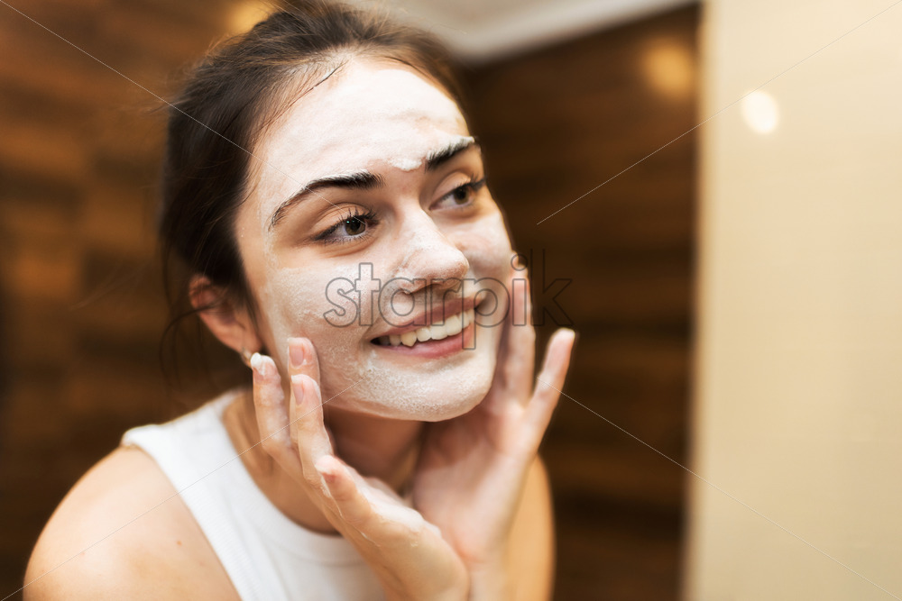 A young caucasian smiling woman is doing a facial massage looking in the mirror