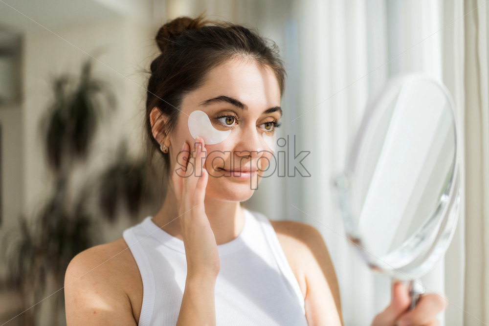 Home » Shop » photo » A young caucasian smiling woman with patches under her eyes looking in the mirror. Skin care theme