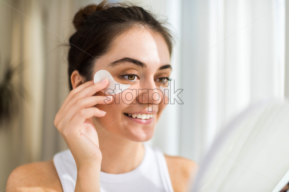 A young caucasian smiling woman with patches under her eyes looking in the mirror. Skin care theme