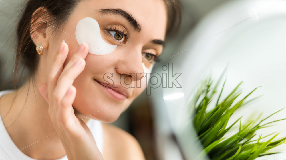 A young caucasian woman placing patches under her eyes. Skin care theme
