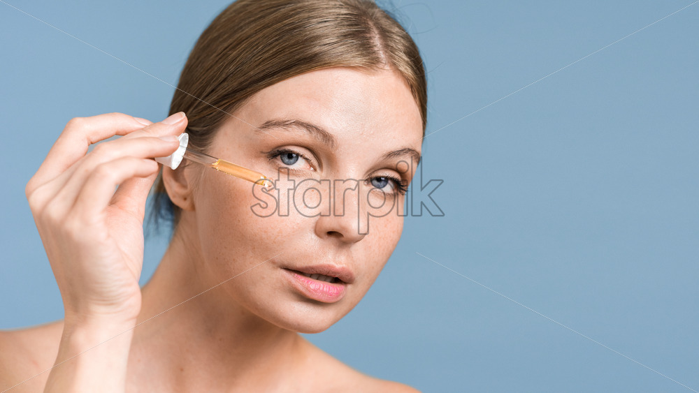 A young caucasian woman is applying and moisturizing face and skin with cosmetic oil, looking into the camera