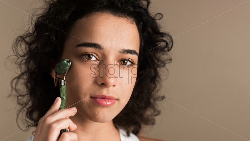 A young caucasian woman is doing a facial massage using a roller, looking into the camera