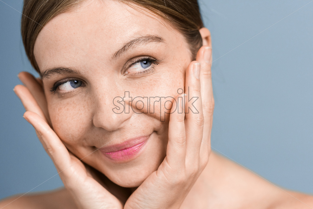 A young caucasian smiling woman is doing a facial massage looking into the camera