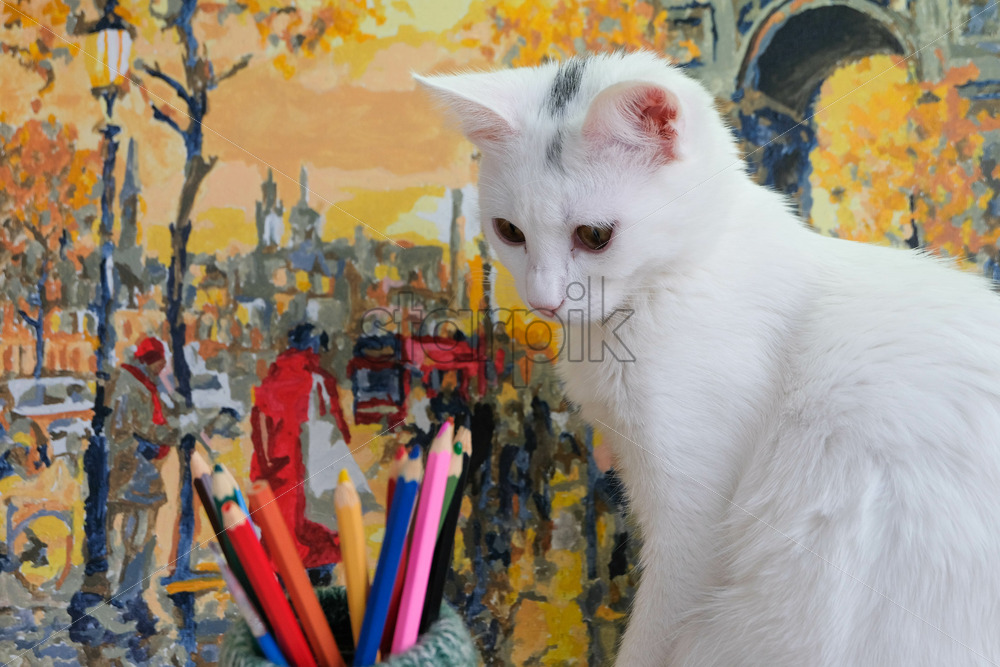 A young domestic white cat looking at the colorful crayons on a beautiful colorful background