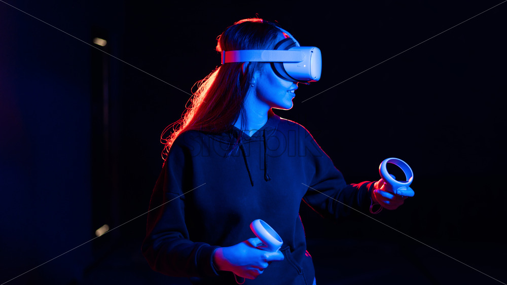 A young excited woman playing in VR games using VR glasses and controllers. Red and blue illumination
