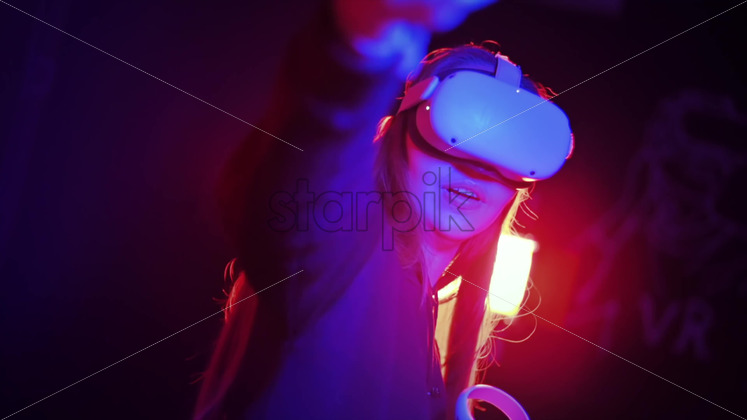 A young interested woman playing in VR games using VR glasses and controllers. Red and blue illumination. Slow motion virtual reality