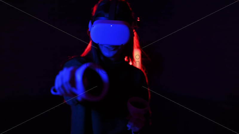 A young interested woman playing in VR games using VR glasses and controllers, red and blue illumination. Slow motion virtual reality