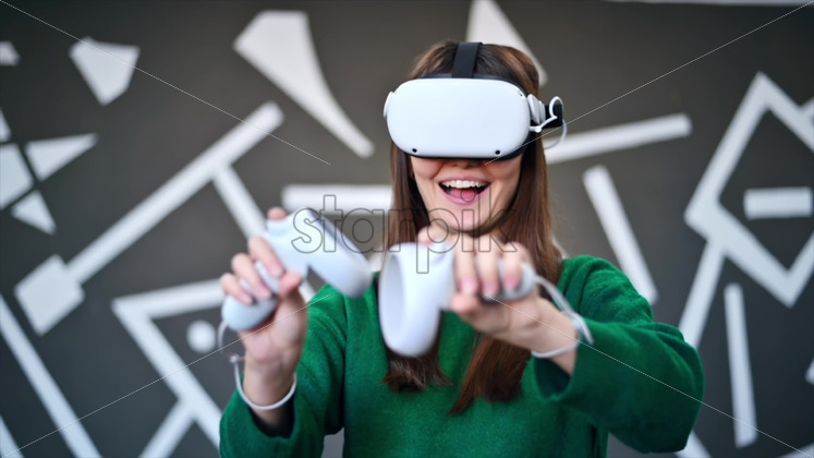 A young interested woman playing in VR games using VR glasses and controllers. Slow motion virtual reality