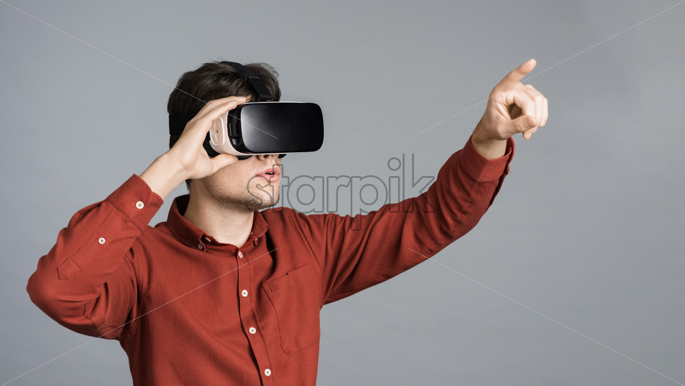 Home » Shop » photo » A young man is playing games using VR glasses, indicating something, gray background