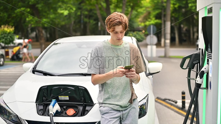 A young man using smartphone at a car charging station with charging electric car nearby. Chisinau, Moldova. Slow motion
